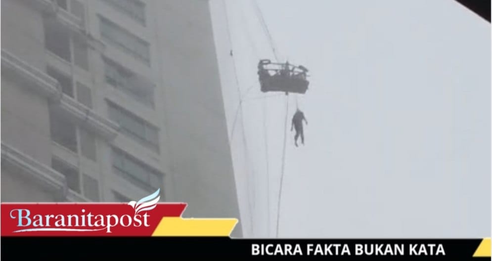 Surabaya , baranitapost.com –— 1 Pekerja tergantung diluar apartemen menggegerkan Surabaya Barat saat hujan deras disertai angin kencang menerjang kawasan tersebut, Senin (2/3/2026) sekitar pukul 14.20 WIB. Seorang pekerja pembersih kaca terperangkap dan tergelantung di lantai 20 sebuah apartemen setelah cuaca ekstrem datang tiba-tiba dan memperparah risiko kerja di ketinggian.