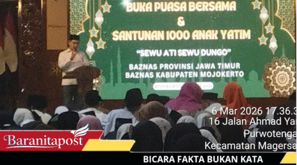 Mojokerto, baranitapost.com – BAZNAS Kabupaten Mojokerto melalui acara Buka Puasa Bersama dan Santunan 1.000 Anak Yatim Non Panti bertajuk “Sewu Ati Sewu Dungo” yang berlangsung pada Jumat, 6 Maret 2026. Kegiatan tersebut dilaksanakan di kantor BAZNAS Kabupaten Mojokerto yang beralamat di Jl. Jend. Ahmad Yani No.16, Kota Mojokerto.