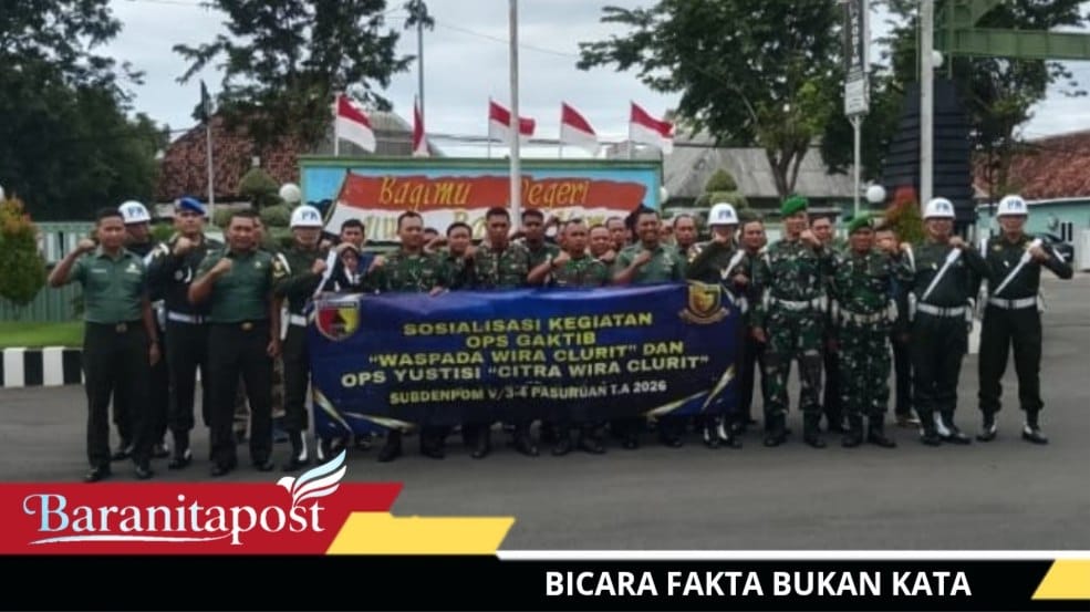 Pasuruan, baranitapost.com — Disiplin prajurit diperketat demi menjaga kehormatan dan profesionalisme TNI. Subdenpom V/3-4 Pasuruan bergerak cepat menggelar sosialisasi Operasi Penegakan Ketertiban (Ops Gaktib) dan Ops Yustisi Tahun Anggaran 2026 di Aula Kodim 0819/Pasuruan, Kamis (26/02/2026). Kegiatan ini diikuti seluruh anggota Kodim 0819/Pasuruan dan aparatur sipil negara di wilayah hukum Subdenpom V/3-4 Pasuruan.