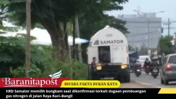 Baranitapost.com – Gresik , HRD PT. Samator bungkam saat dikonfirmasi wartawan terkait dugaan pembuangan gas nitrogen di pinggir Jalan Raya Raci–Bangil, Kabupaten Pasuruan. Peristiwa itu terjadi pada tanggal 18 Februari 2026 sekitar pukul 16.16 WIB di jalur provinsi yang diundang langsung ke kawasan persawahan produktif di Karangpanas, Kecamatan Bangil. Peristiwa tersebut memicu kekhawatiran warga dan pengguna jalan karena terjadi kemacetan, ketika arus kendaraan padat.