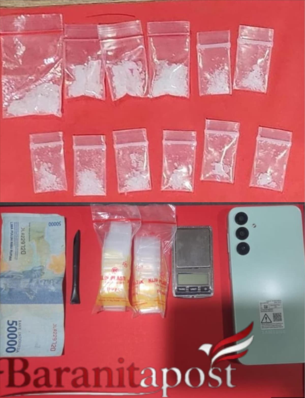Barang bukti itu meliputi 12 paket sabu dengan berat bruto total 6,77 gram, satu unit timbangan digital, dua bendel plastik klip kosong, empat skrop dari sedotan hitam, serta satu unit ponsel yang digunakan untuk komunikasi transaksi.