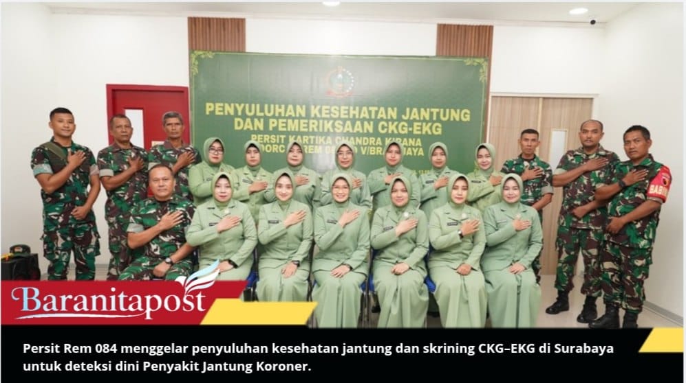 SURABAYA, baranitapost.com – Persit Rem 084 gencarkan skrining jantung melalui penyuluhan kesehatan dan pemeriksaan CKG–EKG yang digelar di Aula Persit Korem 084/Bhaskara Jaya, Jumat (13/2/2026). Kegiatan ini menargetkan peningkatan kesadaran serta deteksi dini Penyakit Jantung Koroner (PJK), yang masih menjadi penyebab kematian tertinggi di Indonesia.