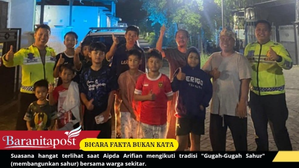 Suasana hangat terlihat saat Aipda Arifian mengikuti tradisi “Gugah-Gugah Sahur” (membangunkan sahur) bersama warga sekitar. Dengan penuh semangat, petugas mendampingi pemuda dan anak – anak setempat berkeliling perumahan untuk memastikan warga bangun tepat waktu guna menjalankan ibadah puasa.