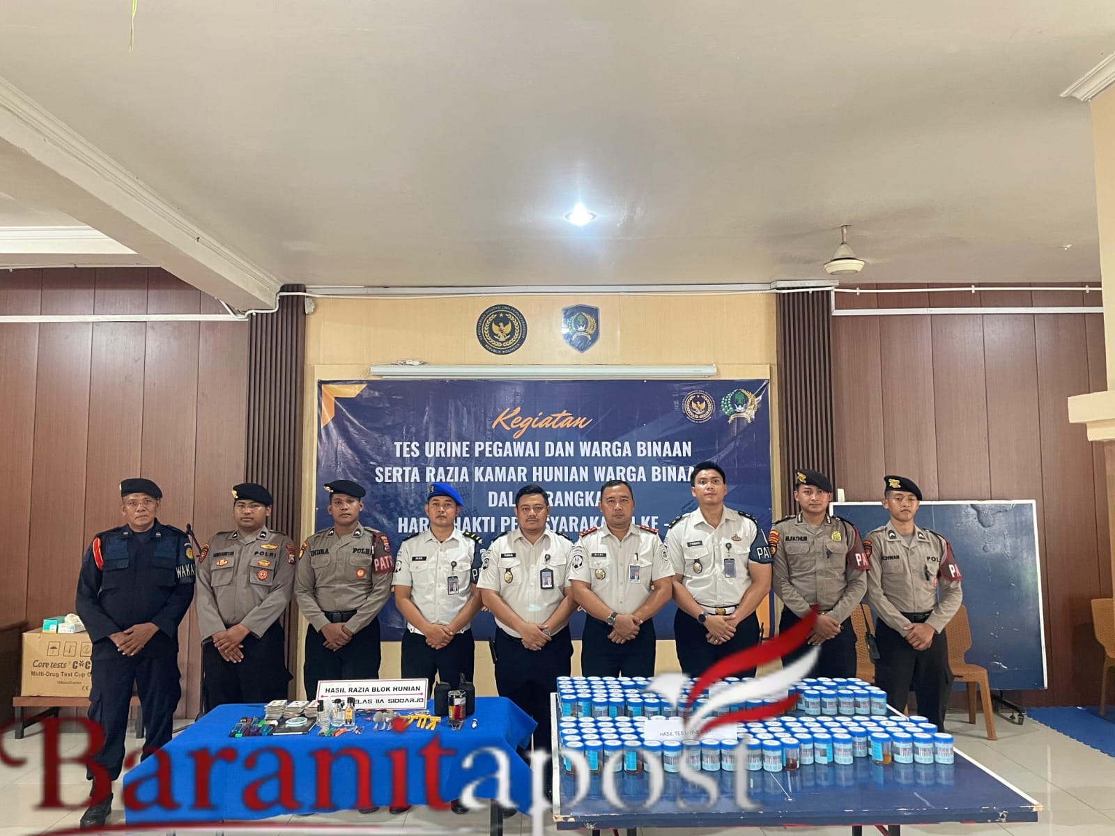 Sidoarjo,baranitapost.com— Tes urin Lapas Sidoarjo digelar di aula kunjungan Lembaga Pemasyarakatan Kelas IIA Sidoarjo, Senin (6/4/2026), melibatkan seluruh pegawai dan warga binaan dengan pengawasan aparat kepolisian.